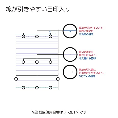 Garis beraturan dirancang untuk kemudahan penggunaan, dengan titik memori segitiga yang diletakkan di tengah dan di tepi kiri untuk membantu Anda menggambar garis vertikal dengan akurat, mirip dengan Campus Notebook. Buku catatan menggunakan kertas dasar original KOKUYO, yang mencegah tinta merembes ke sisi balik halaman. Kertas netral juga cocok untuk pelestarian jangka panjang.