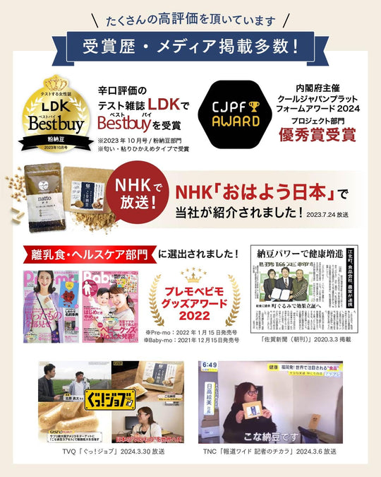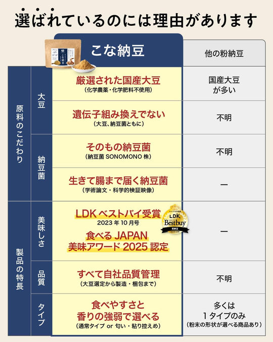 Kona Natto adalah bubuk natto 100% yang dibuat dari kedelai Jepang non-rekayasa genetika, sepenuhnya bebas bahan tambahan. Dengan metode pengeringan beku, nilai gizi dan bakteri baik natto tetap terjaga, sehingga menjadi cara praktis untuk mendapatkan manfaat kesehatannya. Bubuk serbaguna ini mudah ditambahkan ke makanan, menambah rasa dan tekstur, serta cocok untuk makanan bayi dan makanan perawatan karena butirannya halus. Bagi yang sensitif terhadap cita rasa khas natto, tersedia varian dengan aroma dan kelengketan yang lebih ringan.