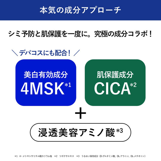 L'ingrediente attivo sbiancante 4MSK* agisce direttamente alla fonte delle imperfezioni. Penetra in profondità nella texture della pelle (fino allo strato corneo). Questa lozione sbiancante di grado siero** previene lentiggini e macchie e idrata la pelle, rendendola più luminosa e chiara.