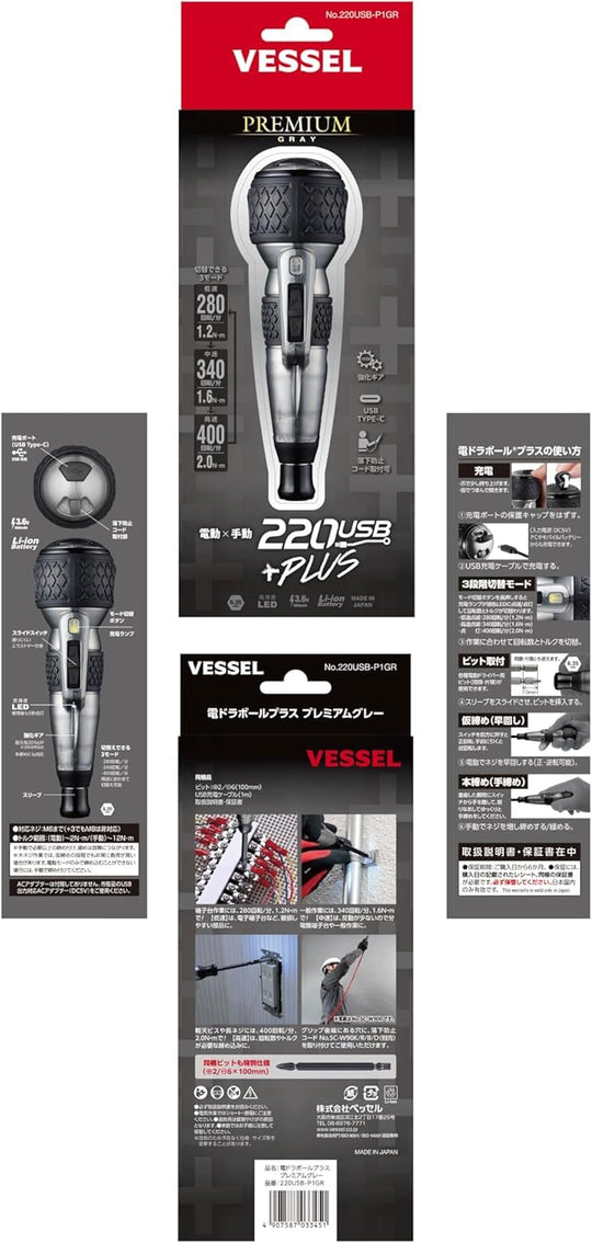 VESSEL Cacciavite Elettrico con Impugnatura a Sfera 3 Modalità 220USB-P1GR Grigio