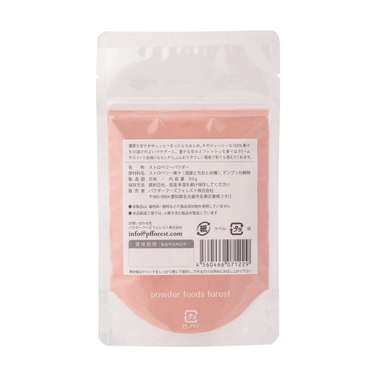 Gli ingredienti includono succo di fragola della varietà giapponese Tochiotome e prodotti di degradazione dell'amido. La polvere è prodotta secondo rigorosi standard di sicurezza in Giappone, garantendo alta qualità e sicurezza.