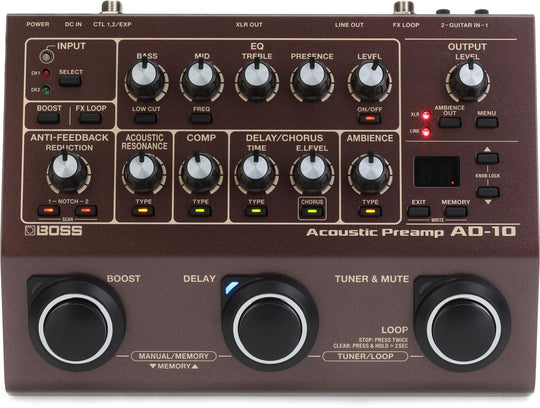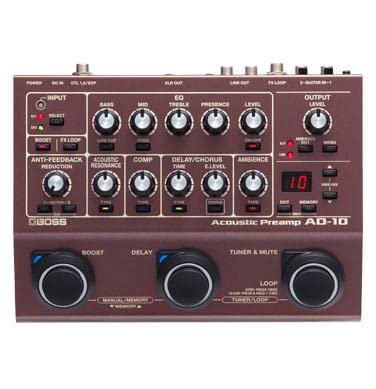 L'AD-10 vanta una funzione di Risonanza Acustica per ripristinare il suono naturale di una chitarra acustica, completata da un compressore basato su tecnologia MDP per una sensazione di suonabilità naturale. Altre caratteristiche includono una funzione Ambience per migliorare il suono e i familiari effetti Delay/Chorus. L'unità offre anche riduzione del feedback con specializzazione a bassa frequenza e filtri notch automatici. Una funzione looper consente di registrare fino a 80 secondi, migliorando le esibizioni dal vivo.