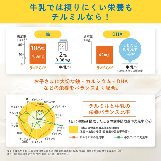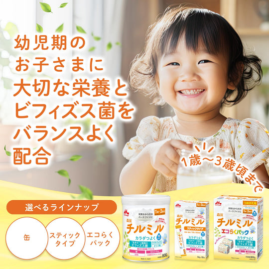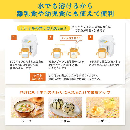 Chil Mil contiene ferro, calcio, DHA e 18 vitamine, minerali e nucleotidi per supportare la crescita. Include due tipi di bifidobatteri vivi (BB536 e M-16V) e tre tipi di oligosaccaridi per promuovere una flora intestinale sana. La lattoferrina, un componente importante presente nel latte materno, è inclusa per ulteriori benefici per la salute. La formula si dissolve facilmente in acqua, rendendola comoda per l'uso nei cibi per bambini e per esercitarsi a bere dal bicchiere.
