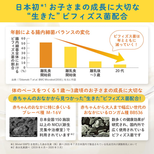 La formula include lattosio, prodotti di degradazione dell'amido, grassi regolati (olio di palma, olio di palmisto, olio di soia, olio di canola), siero di latte in polvere, caseina, latte scremato in polvere, proteine del siero di latte, latticello in polvere, prodotti di degradazione del lattosio (lattulosio), soluzione di galatto-oligosaccaridi, olio di pesce purificato, raffinosio, digestione della caseina e polvere di Bifidobacterium. Contiene anche varie vitamine e minerali come carbonato di calcio, cloruro di magnesio, fosfato tricalcico, lecitina, citrato trisodico, cloruro di calcio, carbonato di potassio, fosfato dipotassico, vitamina C, lattoferrina, cloruro di potassio, pirofosfato ferrico, acido citrico, nicotinamide, vitamina E, pantotenato di calcio, citidilato di sodio, inosinate di sodio, guanilato di sodio, uridilato di sodio, vitamina A, vitamina B6, acido 5'-adenilico, vitamina B1, vitamina B2, acido folico, beta-carotene, vitamina D3 e vitamina B12.