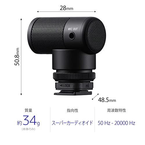 コンパクトなサイズでありながら、大口径のマイクカプセルを搭載し、クリアな音質と低ノイズを実現するショットガンマイクです。ショットガンマイクシュー形状:マルチインターフェースシュー本体電源供給方法マルチインターフェースシュープラグインパワー供給タイプ:バックエレクトレットコンデンサーモノ/ステレオ:モノ指向性:スーパーカーディオイド周波数特性:50Hz-20000Hz付属品:ウインドスクリーン、端子保護キャップ、ポーチ、録音ケーブルサイズ:28.0(W)x50.8(H)x48.5(D)mm 34g(本体のみ)