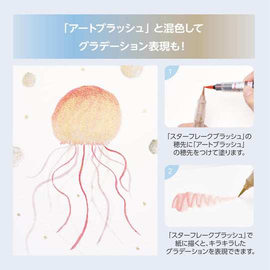 ラメをさりげなく配合した透明インクのブラシペンセットです。カラーはゴールド、パステルイエロー、パステルミントの3色。 手紙やイラストに彩りを添えるのに最適です。 筆先はブラシタイプで、細かな調整がしやすく、思い通りに作品を仕上げられます。 透明ベースのラメインクは塗りに遊び心をプラスし、重ね塗りによるカラー表現も楽しめます。