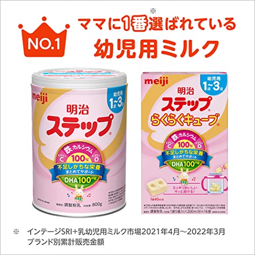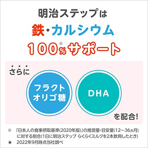 明治ステップらくらくミルクは、1歳から3歳の子供のために設計された液体乳児用ミルクです。このミルクは、身体の成長と脳の発達をサポートし、この年齢層に必要な鉄分とカルシウムの1日の摂取量の半分以上を提供します。さらに、7つの必須ビタミンの1日の摂取量の3分の1以上を供給します。特にDHAの含有は脳の成長に重要であり、このミルクは幼児の食事に貴重な追加となります。