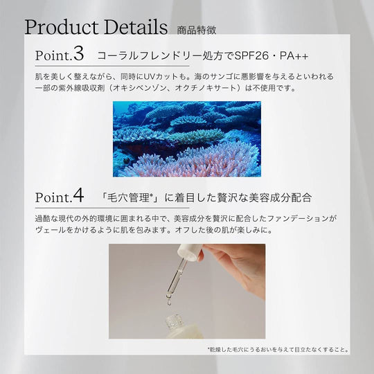 この製品は、透明感のあるセミマットな肌を求める方に向けて設計されています。ベースメイクにおいて、カバー力と透明感のバランスを重視しており、特に毛穴の目立ちが気になる方に適しています。ファンデーションは、清潔で輝くマットな仕上がりを提供し、赤みや肌の凹凸、毛穴の目立ちといった一般的な肌の悩みに対応します。軽量なフォーミュラで、重さや不快感を感じさせず、マスクの下でも一日中快適に使用できます。また、SPF26/PA++のUVプロテクションを備え、サンゴに優しい処方で、海洋生態系に有害なUV吸収剤を含んでいません。