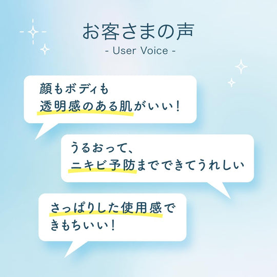 2種のヒアルロン酸(ナノヒアルロン酸を含む)、リン酸アスコルビルMg(ビタミンC誘導体)、ビタミンE、ハトムギ(Job’s tears)発酵液、ヨクイニンエキスを配合。ベタつかず、うるおいが長続きし、キメの整った肌へ。