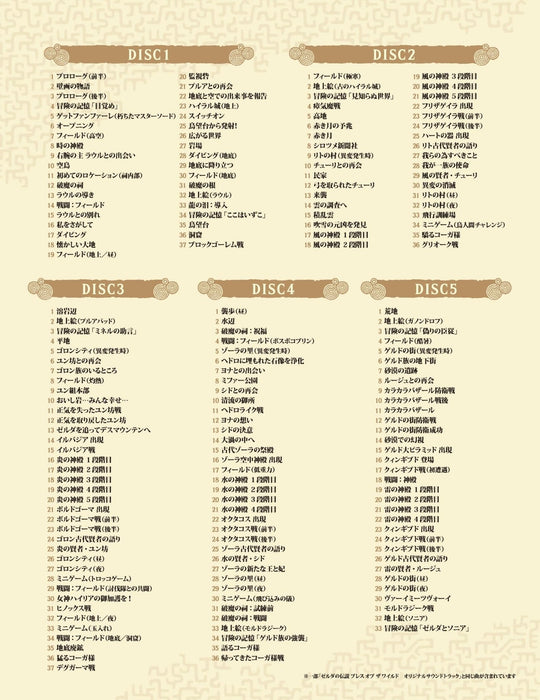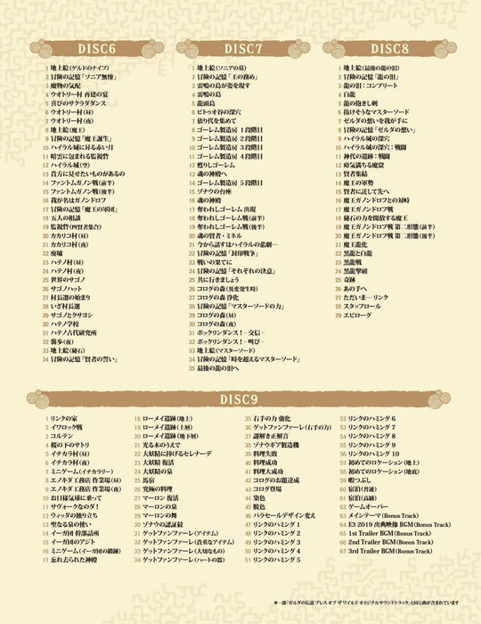 - **エディションオプション**: 初回限定版と通常版の2種類(CDの内容は同一)。 - **トラック数**: ゲーム内音楽とトレーラー曲を含む344曲。 - **総再生時間**: 約11時間。 - **メディア形式**: 9枚のCD。 - **パッケージ**: 三方背の豪華ボックスに、トールサイズのデジパックデザイン。 - **初回限定版特典**: マスターソード型のオリジナルUSBドライブが付属し、15曲の高解像度トラックを収録(3曲は5.1ch FLAC 96kHz/24bit、12曲はFLAC 96kHz/24bit)。