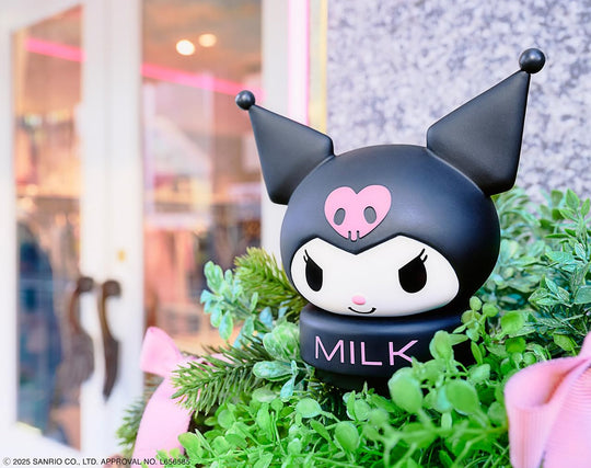 黒いフードをかぶったスカルデザインは、MILKとのコラボのために特別に作られたハート型のスカルです。ライトの台座にはMILKのロゴがあり、背面にはKUROMIとMILKのダブルネームが施されています。点灯していない時でも、かわいいデザインがオブジェとしてお部屋の雰囲気を引き立てます。