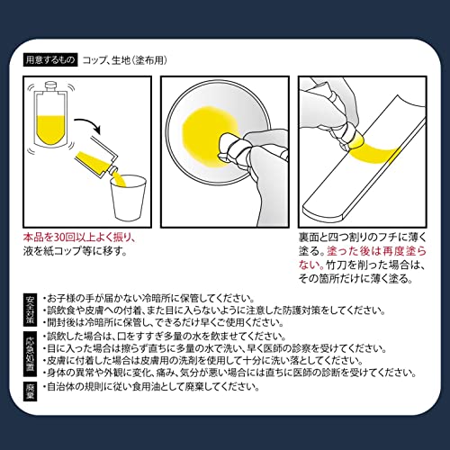 この製品を少なくとも30回よく振り、液体を紙コップなどに移します。四方割れの背面と縁に薄く塗布してください。塗布後は再度塗布しないでください。竹刀が削られている場合は、削られた部分のみに薄く塗布してください。開封後は涼しく暗い場所に保管し、できるだけ早く使用してください。
