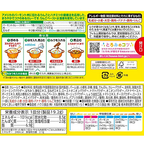 본 카레는 식용유 및 지방 (소기름/돼지기름 혼합, 팜오일), 밀가루, 설탕, 소금, 전분, 카레 파우더, 설탕/분유 혼합물, 전지분유, 대두 스킴, 꿀, 가공즈, 양파 추출물, 로스트 양파 파우더, 토마토 파우더, 양파 파우더, 돼지 추출물, 바나나 페이스트, 원유분, 코코아, 이스트 추출물, 참기름, 토마토 조미료, 사과 페이스트, 향신료, 가공된 간장, 마늘 파우더, 로스트 마늘 파우더, 치즈, 토마토 추출물, 착색료 (카라멜, 파프리카 색상), 조미료 (아미노산), 유화제, 향, 산도 조미료 추출물 등 다양한 식재료로 만들어졌습니다. 일부 성분에는 닭이 들어 있습니다.