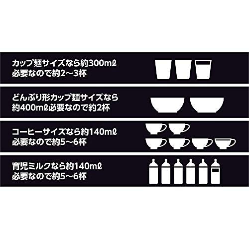 주전자의 용량은 800ml로, 한 번에 2-3명에게 물을 끓일 수 있습니다. 컵라면, 커피, 컵야키소바, 그릇에 넣은 즉석 라면 등 많은 뜨거운 물이 필요한 음식을 즐길 수 있습니다. 뜨거운 물의 대략적인 양은 800ml로, 컵라면 2-3개, 도부리 컵라면 2개, 커피 5-6잔, 유아용 분유 5-6잔 정도입니다.