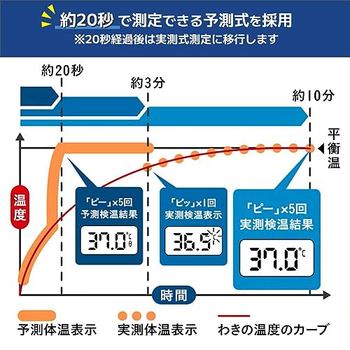 Tanita 의료 기기는 온도 측정에 사용되는 상당히 정확하고 신뢰성 있는 도구입니다. 이 기기는 큰 디스플레이와 백라이트가 있어서 약한 빛 환경에서도 결과를 쉽게 읽을 수 있습니다. 부상의 위험 없이 안전하게 측정할 수 있도록 부드러운 끝부분이 설계되어 있습니다. 이 기기는 예측과 실제 측정 방법 모두를 제공하며, 예측 측정은 20초, 실제 측정은 10분의 측정 시간이 소요됩니다. 기기의 측정 범위는 32.0~42.0°C이며 정확도는 ±0.1°C입니다. 또한 오디오 알람, 자동 전원 꺼짐, 이전 값 표시 기능이 포함되어 사용자 편의성을 높였습니다. 이 기기는 CR2032 버튼 배터리로 작동하며, 배터리를 포함하여 약 23g입니다. 집안 이동과 저장이 편리한 케이스가 함께 제공됩니다.