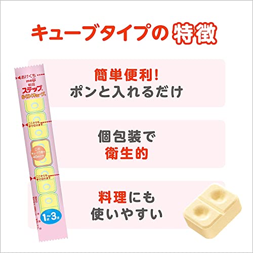 "메이지 스텝"은 1세에서 3세까지의 아이들을 위한 큐브형 이유식입니다. 이 제품은 준비하기 쉽고 어디에나 언제나 사용할 수 있습니다. 모유, 소유, 또는 식사로 얻기 어려운 영양소를 보충합니다. 이 제품은 1세에서 3세의 아이들을 위한 일본의 영양기준 2015년판에서 철과 칼슘의 충분한 섭취를 지원합니다. 또한, 다른 주요 비타민과 무기질의 추천량의 70% 이상을 지원합니다. 단단한 형태의 이유식은 스푼이 필요 없으며, 한눈에 얼마나 넣었는지 확인할 수 있습니다. 또한, 썰거나 다지는 것이 필요 없습니다. 개봉하지 않은 패키지는 장기간 보관할 수 있습니다. "메이지 스텝 라쿠라쿠 큐브"는 "메이지 스텝 (입자 형태)"과 동일한 영양성분을 가지고 있어, 함께 사용할 수 있습니다. 큐브가 깨져도 영양성분은 변하지 않습니다. 제품에는 프리미엄이 포함되어 있습니다.