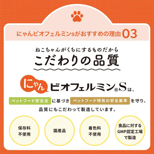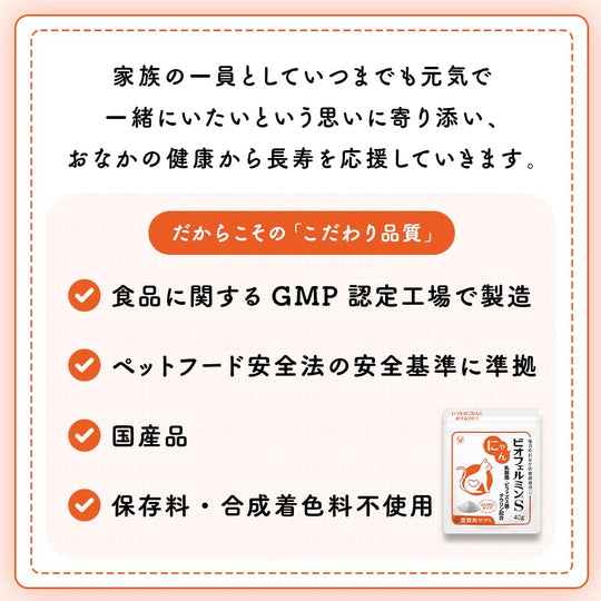 - 살아있는 비피더스균과 유산균 함유 - 고양이 필수 영양소인 타우린 포함 - 음식과 쉽게 섞을 수 있는 분말 형태 - 정확한 일일 투여를 위한 계량 스푼 포함 - GMP 인증 시설에서 제조 - 반려동물 식품 안전법 기준 준수 - 방부제와 합성 착색제 무첨가 - 일본산