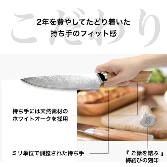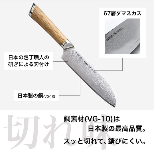 hana 산토쿠 나이프의 손잡이는 경도, 강도, 수분 저항성으로 알려진 백참나무로 제작되었습니다. 나무의 아름다운 나무결은 나이프에 색상과 우아함을 더합니다. 손잡이의 핏은 밀리미터 단위로 세심하게 조정되어 완벽한 균형과 편안함을 달성했습니다.
