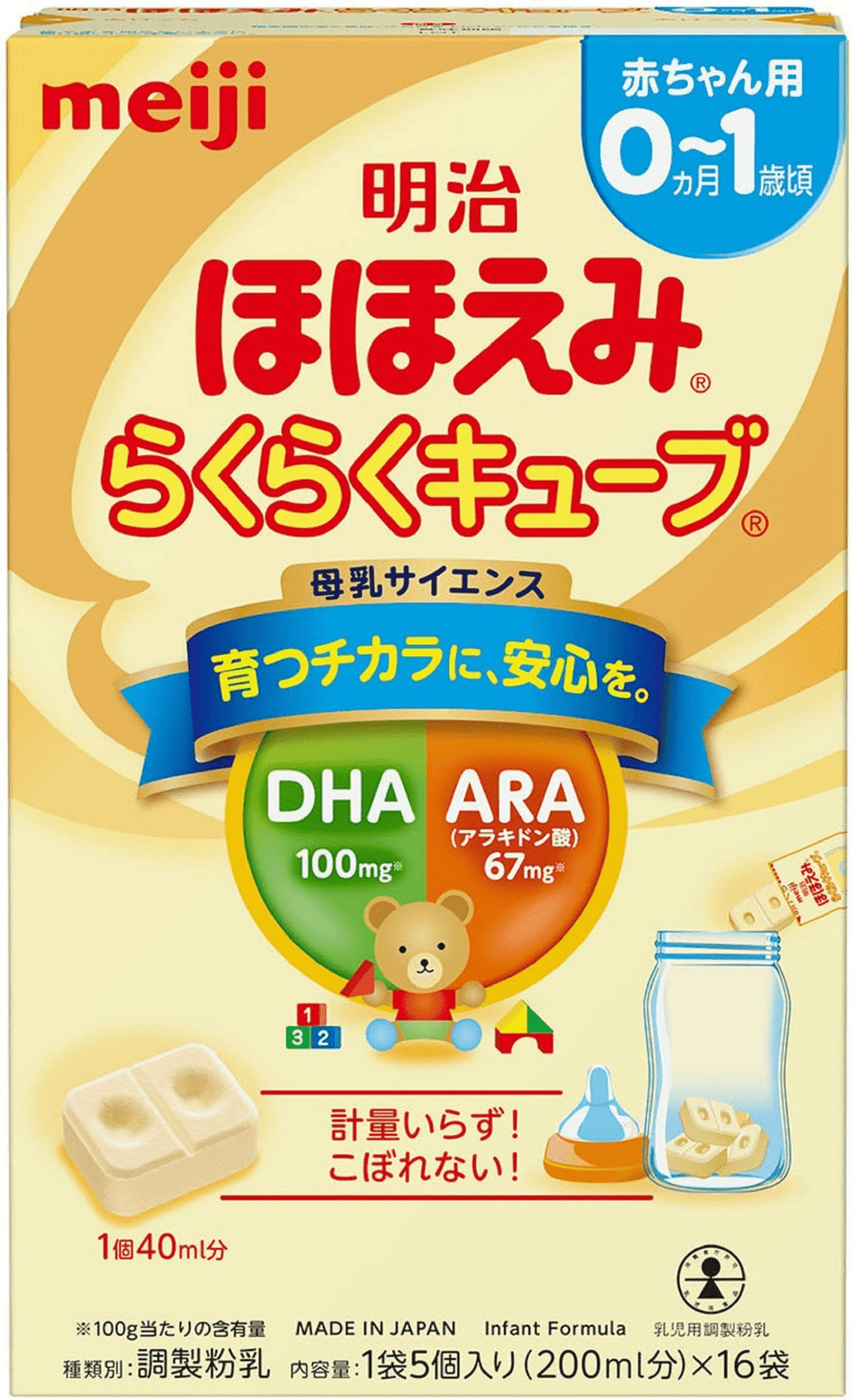 Formula susu bayi bentuk kubus yang berasal dari "Meiji Hohoemi," dirancang untuk memudahkan penggunaan oleh siapa saja, kapan saja, dan di mana saja. Ini adalah puncak dari penelitian ekstensif, termasuk "stud...