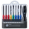 Set pemutar skru kompak dan sedia digunakan untuk rumah, pejabat dan kaunter runcit. Batang boleh tukar berkod warna boleh dipadankan dengan pemegang ergonomik yang mesra tapak tangan, atau digunakan sendiri untuk ruang sempit. Hujung bermagnet (hanya Phillips dan Slotted) membantu mengambil dan memegang pengikat, dan tapak yang disertakan memastikan semuanya tersusun.