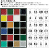 - Warna: Gofun, Hitam, Ungu, Nila, Biru, Ultramarin, Kuning Muda, Kumpulan Putih, Hijau Tua, Hijau Tembaga, Hijau Rumput, Daun Muda, Hijau Pucat, Kuning Rumput, Kuning, Oker, Vermilion, Daisha, Peoni, Rouge, Merah Kirmizi, Bunga Plum, Emas, Perak