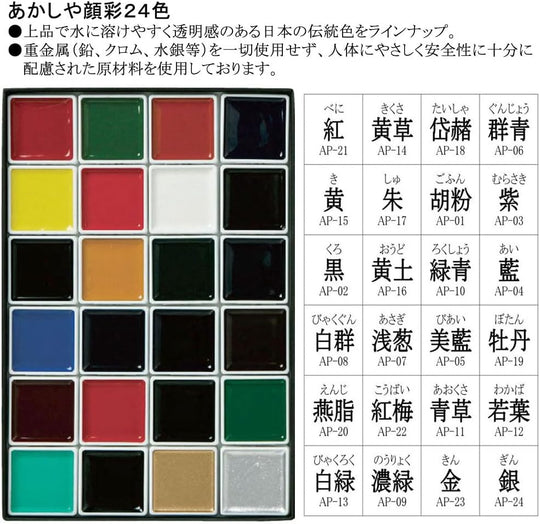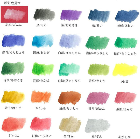 Set cat air tradisional Jepun 24 warna ini sesuai untuk menghasilkan karya yang elegan dan lutsinar. Warnanya dipilih dengan teliti dan mudah larut dalam air. Diperbuat daripada bahan selamat dan tidak toksik, cat ini bebas daripada logam berat seperti plumbum, kromium dan merkuri. Bekasnya direka untuk kemudahan penggunaan, dibangunkan dengan kerjasama sekolah seni.