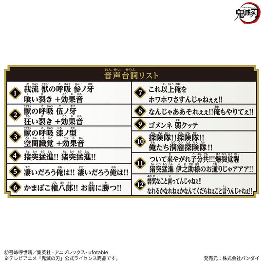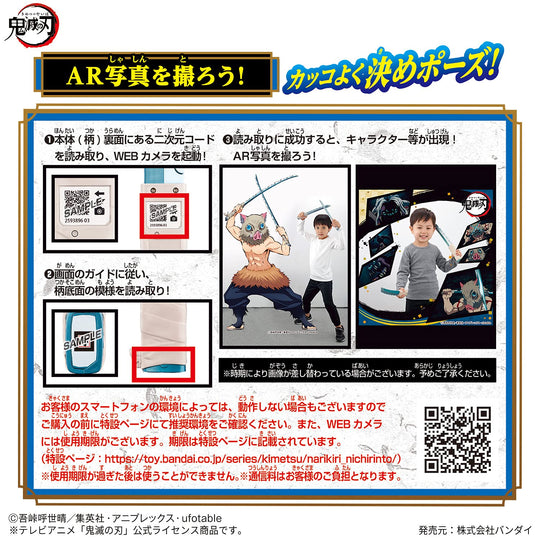 Menyelami dunia "Blade of Demon's Destruction" dengan siri NARIKIRI Nichirin Katana, dengan suara Inosuke Kizuhira dari anime TV yang disukai ramai. Katana mainan interaktif ini menawarkan pengalaman realiti tambah (AR) yang unik. Dengan mengimbas kod 2D di belakang gagang menggunakan kamera telefon pintar anda, anda dapat mengambil foto AR bersama watak-watak dari siri tersebut. Katana ini menyertakan pelbagai kesan bunyi, dengan 12 jenis kata-kata dan bunyi dialog langsung dari rancangan tersebut, meningkatkan pengalaman bermain peranan anda. Set ini mengandungi dua badan utama, satu dengan komponen elektronik untuk bunyi dan fungsi AR, dan satu tanpa. Panjang total katana adalah kira-kira 35 cm.