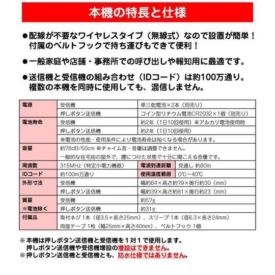 - Voedingsbron: - Ontvanger: 2 x AA droge celbatterijen (apart verkrijgbaar) - Drukknopzender: 1 x CR2032 platte lithiumbatterij (apart verkrijgbaar) - Batterijlevensduur: - Ontvanger: Ongeveer 2 jaar (gebaseerd op 10 keer gebruik per dag met alkalinebatterijen) - Drukknopzender: Ongeveer 2 jaar (gebaseerd op 10 keer gebruik per dag) - Let op: De batterijlevensduur kan variëren afhankelijk van de batterijprestaties en de gebruiksomstandigheden.