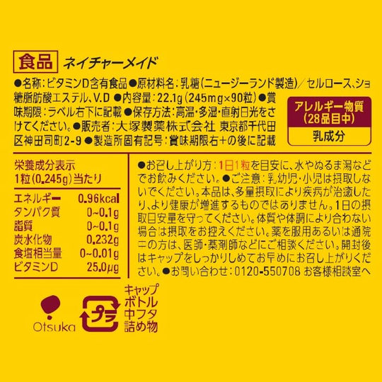 In de Verenigde Staten wint vitamine D-suppletie aan populariteit onder mensen die zich bewust zijn van hun levensstijl, vooral bij wie weinig aan zonlicht wordt blootgesteld. Nature Made, ontwikkeld door Otsuka Pharmaceutical in samenwerking met Pharmavite, biedt een hoogwaardige vitamine D-supplement dat is afgestemd op de behoeften van de Japanse bevolking. Deze verpakking bevat 90 capsules, goed voor een voorraad van 90 dagen bij het aanbevolen gebruik van één capsule per dag.