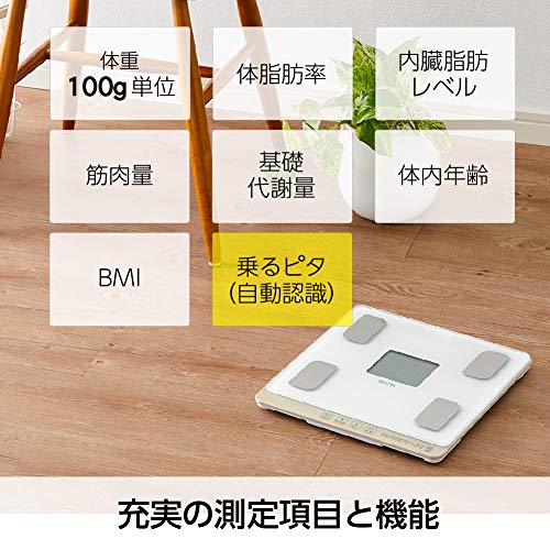 >・De "Mijn Ondersteuning Functie" verandert het display volgens de frequentie van meting om dagelijkse meting te ondersteunen. De "Snelle Gewichtstoename / Afname Meldingsfunctie" waarschuwt u wanneer uw gewicht plotseling verandert. De elektrostatische aanraakknop wordt geactiveerd door er simpelweg aan te raken. De "Ride-on Pita functie" maakt meting mogelijk door simpelweg op de weegschaal te stappen. Verticale opslag OK.