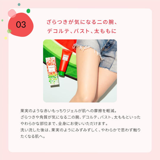Ervaar de essentie van de zomer met deze watermeloen-geurende bodyscrub, ontworpen om je huid glad en verfrist achter te laten. Perfect voor gebieden die gevoelig zijn voor ruwheid zoals armen, decolleté, buste en dijen. Deze scrub heeft een unieke rode gel met zwarte vitaminecapsules die niet alleen exfoliëren, maar ook hydrateren en je huid verjongen. De heerlijke watermeloen geur versterkt je body polishing sessie, waardoor het een plezierige huidverzorgingsroutine wordt.