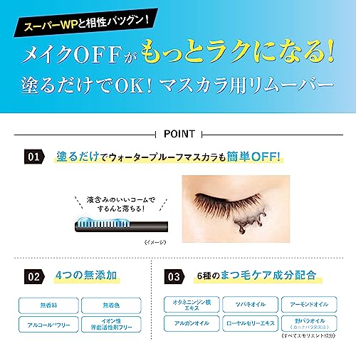 Verwijder sterke mascara snel en moeiteloos met deze mascara remover. Zelfs hardnekkige waterproof mascara kan gemakkelijk worden vermengd en verwijderd zonder te hoeven scrubben. De formule is zacht voor de wimpers en bevat hydraterende ingrediënten zoals ginsengwortel-extract, camellia-olie, amandelolie, arganolie, koninginnengelei-extract en wilde rozenolie. Deze ingrediënten helpen de wimpers te voeden en te beschermen terwijl ze effectief make-up verwijderen. De remover is vrij van geuren, kleurstoffen, ionische oppervlakteactieve stoffen en alcohol, waardoor het geschikt is voor gevoelige ogen. Het is ontworpen om bestand te zijn tegen vlekken op de ogen en is geschikt voor dagelijks gebruik. Let op: dit product wordt vervaardigd in Japan en is bedoeld voor gebruik door vrouwen.