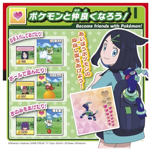 Neem deel aan gevechten door herhaaldelijk op het hoofdgedeelte van het Pokémon-speeltje te slaan om de meter te verhogen. Wanneer de meter het "Vang" vak bereikt, sluit je de Monsterbal op het juiste moment om de Pokémon te vangen. Doe mee aan verschillende uitdagingen zoals "roepen om te vangen", "achtervolgen om te vangen" en "op ritme vangen" om verschillende Pokémon te vangen. Verzorg je Pokémon-maatje door het Bessen te voeren en ermee te spelen om je Vriendschapsniveau te verhogen, waardoor het makkelijker wordt om speciale bewegingen in gevechten uit te voeren.