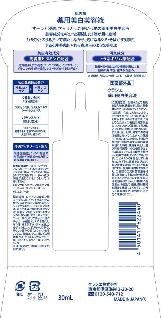 Overige ingrediënten: Yuzu ceramide, rijstzemelenextract, pioenroosextract, gehydrolyseerde conchioline-oplossing, zijde-extract, yokuinin-extract, soja-extract, bis-ethoxydiglycol cyclohexaan-dicarbonzuur, geconcentreerde glycerine, BG, polyglycerine, ethanol, kaliumhydroxide, POE-geharde ricinusolie, HEDTA-3Na-oplossing, carboxyvinylpolymeer, POE(20) sorbitanlauraat, natriumcitraat, citroenzuur, natriumpyrosulfiet, dehydrodichloorisole, fenoxyethanol, parabeen, water.