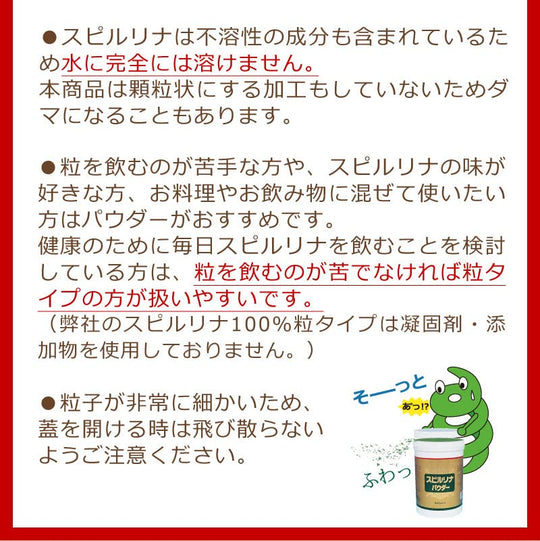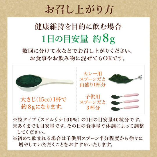 Het product is een 500g verpakking van Spirulina Poeder. De aanbevolen dagelijkse hoeveelheid is 8g, ongeveer een eetlepel. Het kan meerdere keren per dag ingenomen worden met water of andere vloeistoffen, of gebruikt worden in het koken of bakken. Het product wordt gemaakt in Japan en heeft een houdbaarheid van 3 jaar.