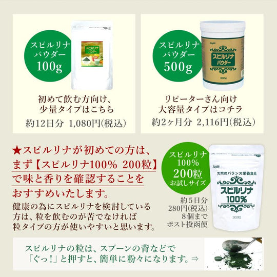 Dit product is een verpakking van 500g Spirulina Poeder, een voedingssupplement dat volledig gemaakt is van Spirulina (cyanobacteriën). Spirulina is een type alg dat sinds de oudheid als voedselbron wordt gebruikt vanwege zijn uitstekende voedingsbalans en hoge verteerbaarheid. Dit product is vooral populair onder vegetariërs en staat hoog aangeschreven om zijn kwaliteit en prijs. Het wordt geproduceerd in Japan en heeft een houdbaarheid van 3 jaar.