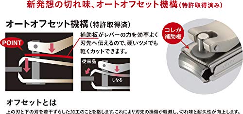 Dit product is een hoogwaardige nagelknipper, ontworpen en vervaardigd in Japan. Het vertegenwoordigt de evolutie van Japanse kwaliteit, licht en scherp. De knipper bevat een nieuw concept van scherpte, met een automatisch offsetmechanisme (gepatenteerd) en een nieuw aangenomen hulpplaat dat zorgt voor een optimale mesbetrokkenheid. Dit ontwerp laat de knipkracht efficiënt overbrengen naar het snijvlak, waardoor u comfortabel kunt knippen met een lichte aanraking, ongeacht de hardheid of dikte van de nagel. Het automatische offsetmechanisme vermindert de weerstand op het moment van knippen met ongeveer 50% in vergelijking met conventionele producten, wat resulteert in superieure duurzaamheid en een gladder dwarsdoorsnede van de nagel. De knipper bevat ook een vijl die geëtst is om een gladde afwerking van de nagel te garanderen.