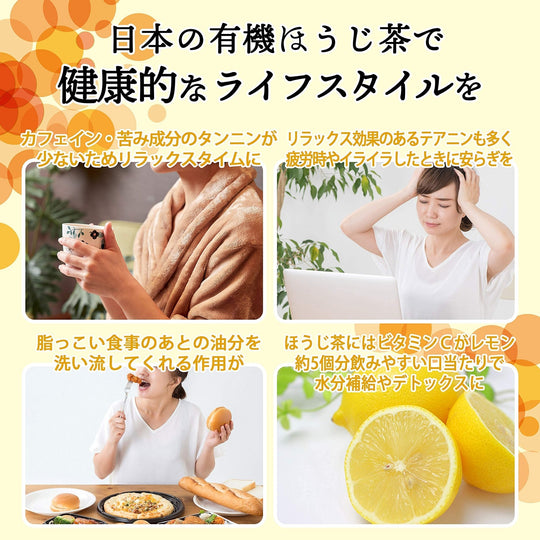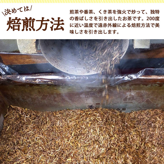 De hojicha thee is gecertificeerd door JONA en Organic JAS, wat garandeert dat het voldoet aan strenge kwaliteitsnormen. Het wordt geproduceerd zonder het gebruik van pesticiden en is bij hoge temperaturen gebrand om de niveaus van cafeïne en tannine te verlagen, waardoor het minder wrang en bitter is. Dit proces versterkt ook het geurige aroma van de thee. De houdbaarheid van de thee strekt zich uit tot een jaar vanaf de productiedatum, wat langdurige opslag mogelijk maakt. Geschikt voor een breed scala aan consumenten, van zuigelingen tot ouderen, deze thee is een uitstekende keuze voor geschenken voor gelegenheden zoals Moederdag of Vaderdag.