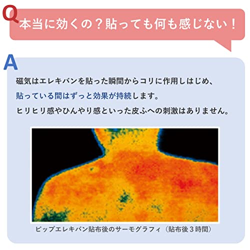ELECHIBAN is a small circular magnetic therapy device that can be used for pinpoint treatment of stiff shoulders, backs, and other stiffness that bothers you. It is odorless and inconspicuous, making it easy to use during the day. The magnetism works on the body's internal components to improve blood circulation within the muscles and release "waste products," thereby approaching the vicious cycle of stiffness and relieving stiffness. It is gentle on the skin and made of Bandoukou, a comfortable, non-irritating, anti-stiffness product that relieves stiffness in the shoulders. It is recommended to apply it for 2 to 5 days, as bathing is possible with it on. Use it for stiff shoulders, back, arms, legs, feet, etc.