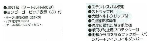 This tape measure is ideal for a variety of measuring tasks, whether in construction, carpentry, or general household use. The high-strength baking claw and 3-point caulking claw with protector ensure accurate measurements and durability. The twin coil damper provides smooth retraction, and the large belt clip and strap offer convenient portability.