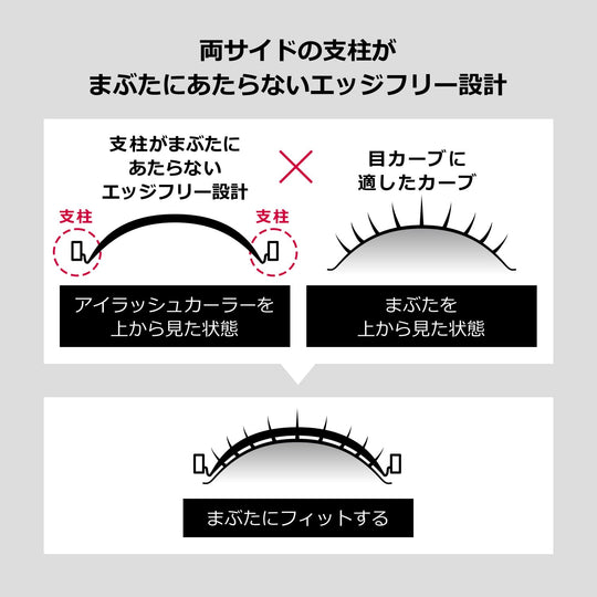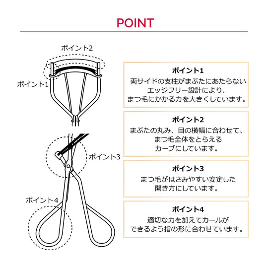 Este curvador de cílios foi projetado para capturar e curvar toda a base dos seus cílios com apenas uma leve pressão. Seu design sem bordas garante que o suporte não toque sua pálpebra, proporcionando uma experiência de curvatura confortável e segura. O curvador é moldado para se ajustar à curva natural do olho, permitindo alcançar e curvar todos os cílios desde a raiz, incluindo aqueles nos cantos externos. Com uma pressão suave, você pode obter cílios lindamente curvados para um visual natural e realçado.