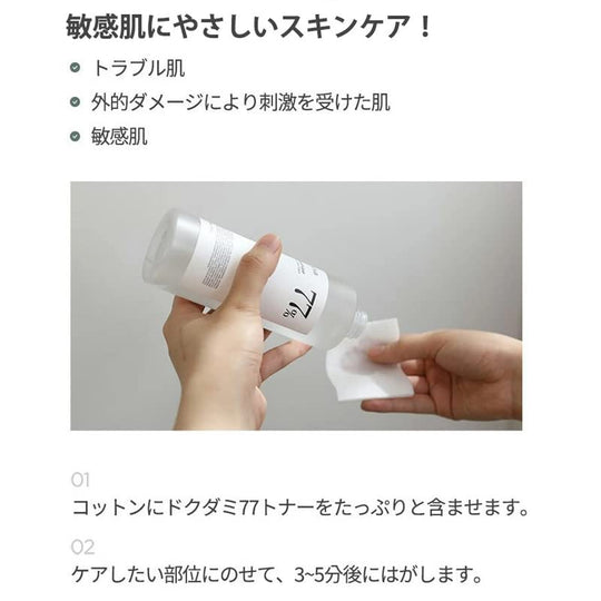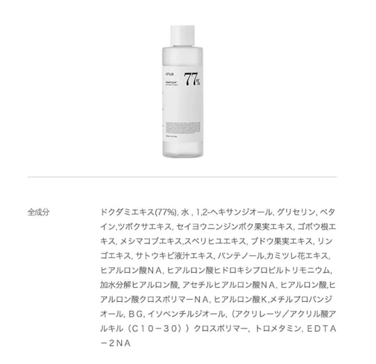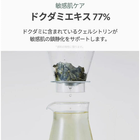 Este produto é projetado para cuidados com a pele sensível, apresentando uma formulação de 77% de extrato de dokudami. É um tônico levemente ácido com um nível de pH de 5,5 a 6, que ajuda a equilibrar o pH da pele. O produto é projetado para eliminar ingredientes desnecessários na pele, contendo apenas os componentes necessários. Ele é ideal para a pele que requer cuidados especiais. O produto foi testado não comedogênico, garantindo que não irá obstruir seus poros. Possui uma textura suave adequada para todos os tipos de pele e contém todos os ingredientes de nível VERDE EWG, indicando sua segurança e amigabilidade ambiental.