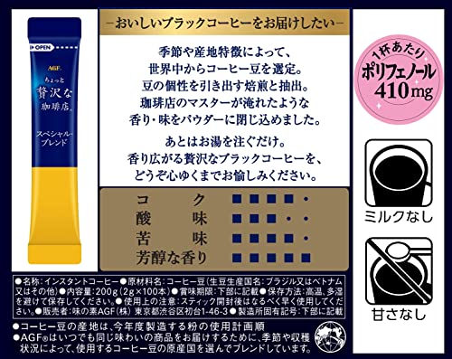 ProdutosDesfrute dos adultos. O café instantâneo "Um Pouco de Luxo na Cafeteria" da AGF é feito dos grãos brasileiros de maior qualidade #2 e torrado com a tecnologia proprietária de torrefação T2ACMI da AGF para alcançar uma riqueza profunda e um sabor residual claro. Este café instantâneo é liofilizado a -40°C sem calor, para que você possa desfrutar do sabor do café recém-brewed sem perder o sabor original do café. As hastes de mistura especial "Cafeteria levemente luxuosa" AGF 100 hastes são feitas dos grãos brasileiros de maior qualidade, que são caracterizados por sua profundidade rica e sabor residual claro. Você vai desfrutar de um sabor autêntico de luxo em tudo o que fazemos, e cada xícara é sempre fresca, café em palito individualmente embalado (preto, sem leite, sem doçura).Desfrute no escritório ou em casa com uma xícara de café preto ou com um palito de açúcar ou um palito de café com leite se você preferir.Tudo, desde a torrefação do grão de café até a embalagem, é produzido em uma fábrica no Japão e desenvolvido para se adequar ao paladar delicado dos japoneses. Um pequeno mas luxuoso momento em um dia, quando você quer relaxar e não ser perturbado por ninguém. Este café é adequado para tal momento.Este café instantâneo é ideal para aqueles que consomem muito café no escritório ou em casa, pois contém 100 xícaras.Como usarPara café quente: Adicione água quente (140ml~180ml) a um palito e ajuste ao seu gosto.Para gelado: Mexa 1 palito com água quente (70ml~90ml) e adicione 5~6 cubos de gelo.Adicione 5~6 cubos de gelo, açúcar ou leite de acordo com o seu gosto.