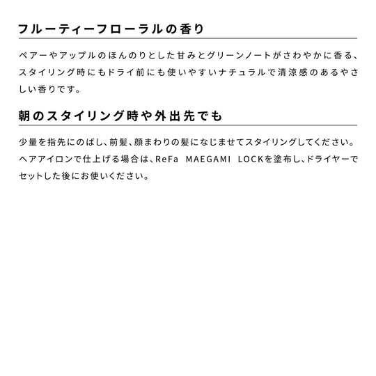 Представляем MAEGAMI LOCK от ReFa — революционное средство для укладки волос, специально разработанное для акцента на проборе. Этот инновационный продукт фиксирует направление волос от корней, обеспечивая естественный вид, который не слишком жесткий и не слишком легкий. С оптимальной степенью фиксации вы можете легко менять стиль на ходу, получая больше свободы для корректировки секущихся концов по вашему желанию. Добейтесь идеального стиля челки для обновленного и свежего образа.