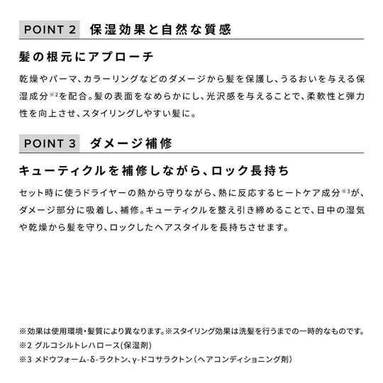 ReFa LOCK TREATMENT облегчает проведение пальцами по волосам, защищая их от ежедневного воздействия сушки. Используя тепло фена, ингредиенты для ухода за волосами фиксируют кутикулу, предотвращая пересушивание и сохраняя влагу. Формула включает γ-докозалактоны, Meadowfoam-δ-лактон (кондиционирующий агент) и левулиновую кислоту (восстановление), создавая тройную защиту для сохранения красоты.