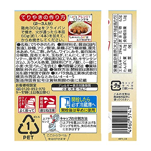 Продукты. Богатый вкус соевого соуса с тертым луком и красным вином позволяет легко приготовить блюда, которые хорошо сочетаются с хлебом, так и с рисом.Просто полейте это на готовое блюдо и запеките.Его можно использовать не только для мяса, но и для терияки-амберджека и популярного гамбургского стейка терияки. Ингредиенты: соевый соус (произведен в Японии), сахар, раствор аминокислот, фруктозо-глюкозный жидкий сахар, сироп с пониженным содержанием сахара, яблочный уксус, мирин, вино, мисо, протеиновый гидролизат, экстракт ламинарии, лук, чеснок, жареный лук, острый перец / загуститель (обработанный крахмал, ксантановая камедь), карамельный цвет, приправа (аминокислота), (некоторые ингредиенты: пшеница, соевые бобы, яблоки)