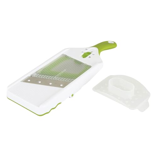 Этот универсальный кухонный инструмент представляет собой регулируемую терку и мандолину для шинковки с возможностью настройки трех уровней толщины (приблизительно 1,5 мм, 3 мм и 4,5 мм), что позволяет точно нар...