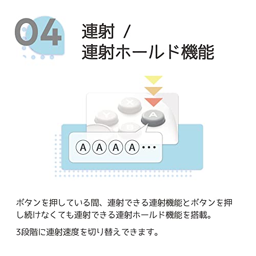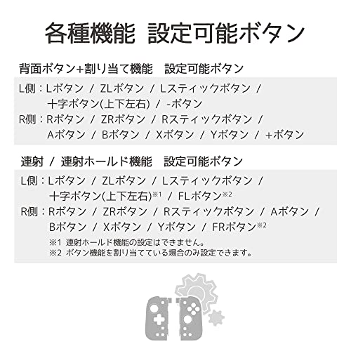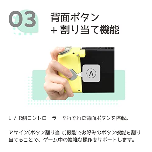 Контроллер предназначен для использования в портативном режиме Nintendo Switch. Кнопки на задней панели каждой стороны контроллера можно назначить на выбранные функции кнопок, что поддерживает выполнение сложных операций во время игры. Функция непрерывной стрельбы/удержания непрерывной стрельбы позволяет осуществлять непрерывную стрельбу, пока кнопка удерживается, или непрерывную стрельбу даже если кнопка не удерживается. Скорость непрерывной стрельбы можно переключать на трех уровнях.