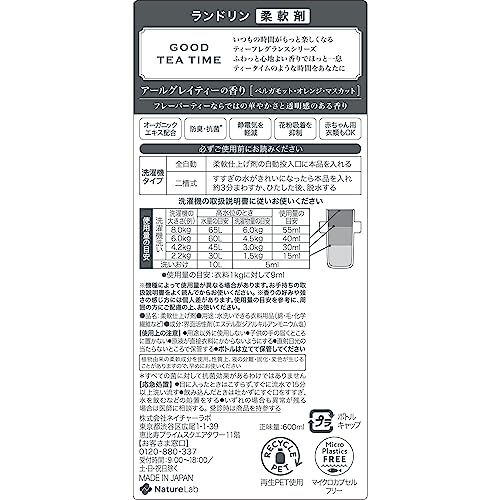 Создан с идеей "аромат как парфюм". Этот кондиционер для белья содержит растительные смягчающие компоненты, обеспечивающие мягкое прикосновение к коже. Серия ароматов чая, в частности аромат чая Эрл Грей, делает повседневную стирку более приятной благодаря своему великолепному и чистому аромату, характерному для ароматизированного чая. В аромате присутствуют ноты бергамота, апельсина и муската.