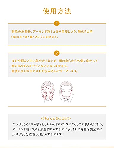 Efter att du har rengjort ditt ansikte på morgonen och kvällen, ta ungefär ett mandelkorn på fingertopparna och massera in i ansiktet. Avsluta sedan genom att föra handen från hakan till tinningarna. För en rik återfuktande upplevelse, använd som en mask. Applicera ett mandelkorn på ansiktet, fördela lika över hela ansiktet och låt verka i ca 3 minuter för att sedan försiktigt blanda in.